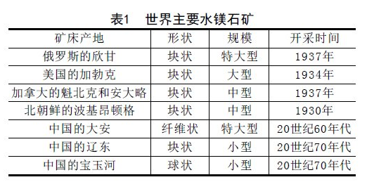 近年來(lái)我國相繼在陜西寧強、青海祁連山、四川石棉、吉林集安、河南西峽、遼寧鳳城、寬甸等地發(fā)現并開(kāi)發(fā)水鎂石礦產(chǎn)。