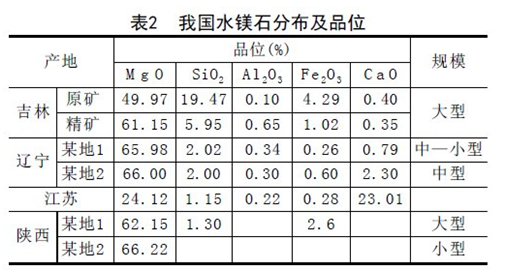目前為止,我國已探明的水鎂石資源總儲量已超過(guò)2500萬(wàn)t,屬中等儲量規模,其礦床分布及品位見(jiàn)表2。