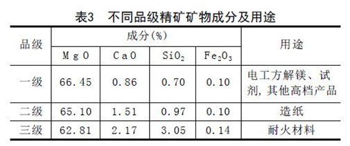 水鎂石是一種很重要的非金屬礦物原料,有很大的經(jīng)濟價(jià)值、其用途很廣。不同的應用領(lǐng)域對水鎂石精礦質(zhì)量要求也不同(見(jiàn)表3)。